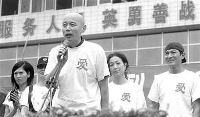作為活動(dòng)的發(fā)起人——四川女婿張國立用四川話鼓勵(lì)大家:“大家辛苦了!地震雖然摧毀了我們的家園,我們可以建設(shè)更好的家園,天災(zāi)雖然無情,但是我們?nèi)硕加星椤N覀円黄鸷八拇佑!四川雄起哈!”現(xiàn)場每一個(gè)人都高舉右手,高呼:“四川加油!四川雄起!” 記者馬丹 攝影劉亮