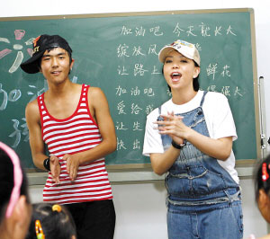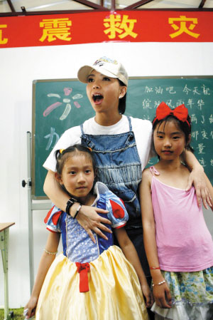 李文害羞地告訴張惠妹,他今年16歲,在都江堰上學(xué)的時候就跟著老師學(xué)唱歌,去年還參加了一個新人比賽拿了全國第二,當(dāng)時的評委老師當(dāng)場就收他為徒。“可惜發(fā)生了地震,我不能再學(xué)唱歌,現(xiàn)在我喜歡和四川音樂學(xué)院的志愿者老師們在一起,他們可以教我唱歌!甭牭嚼钗倪@么說,張惠妹當(dāng)下就表示:“這樣吧,我回臺灣后會跟公司商量一下,我打算收你為徒弟!”