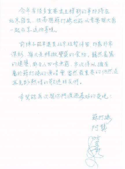 中新網(wǎng)6月10日電 隨著6月15日“陪我唱歌”蘇打綠北京演唱會(huì)的日益臨近,全國(guó)的歌迷翹首以待臺(tái)灣第一樂團(tuán)蘇打綠的到來,演唱會(huì)的門票的銷售情況也是非常的火爆。近日,遠(yuǎn)在臺(tái)灣的蘇打綠樂團(tuán),親自手寫信函來表達(dá)對(duì)歌迷此次演唱會(huì)的支持與厚愛,同時(shí)也表達(dá)對(duì)此次北京之行的急切與喜悅之情。