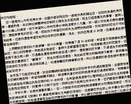 “八卦天王”還在信中向外界透露,自己就是林志玲遭遇“咸豬手”幕后的“真兇”。他稱,在林志玲到訪臺科技大學(xué)演講那天,他只是出于對偶像的愛慕之情,想接觸一下偶像并和她握手,由于太多人圍堵林志玲,所以他僅在人群中伸手摸到林志玲手臂,并非網(wǎng)上所傳聞的敏感部位。
