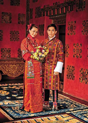 “偉玲”在不丹結(jié)婚成為當(dāng)?shù)匾患⑹拢坏ね跏腋貏e打破慣例,提供皇宮的寢室給新人拍婚紗照,并由不丹皇叔夫婦(即將登基國(guó)王之叔)親自為這對(duì)新人著裝,據(jù)了解,偉仔的禮服正是當(dāng)年皇叔結(jié)婚所穿的禮服,而嘉玲所穿的禮服則是王妃他們?yōu)槟陜H兩歲的女兒日后出嫁所準(zhǔn)備的嫁衣。