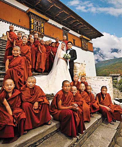 報(bào)道介紹,梁朝偉和劉嘉玲選擇在不丹這個(gè)佛國家辦婚禮,原因不丹是一個(gè)莊嚴(yán)和神圣的地方?鞓分笖(shù)高達(dá)97%的不丹人婚姻實(shí)行一夫多妻或一妻多夫制,更有些不丹民俗需要男方入贅女家。當(dāng)?shù)貍鹘y(tǒng)婚禮非常簡單,一對新人分別穿上不丹傳統(tǒng)服裝“Gho”和“Kira”,在雙方親友見證下進(jìn)行,他們在婚宴上都以簡單的辛辣菜式招呼親友。