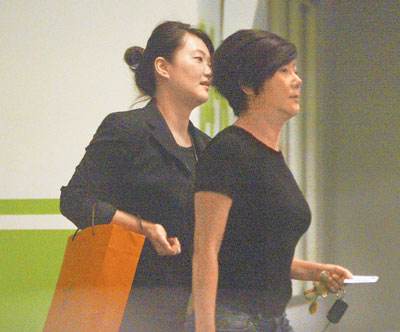 藍(lán)心湄(右)取車(chē)時(shí)有專(zhuān)人負(fù)責(zé)提袋,側(cè)面觀(guān)察她小腹凸出。