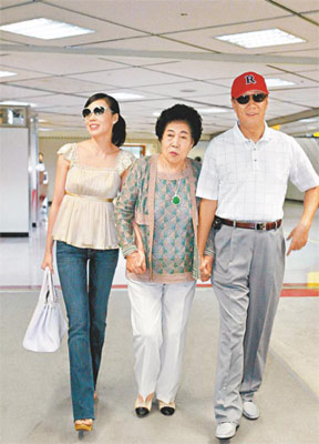 中新網(wǎng)8月7日電 2008年北京奧運(yùn)會(huì)明晚即將開(kāi)幕,新婚11天的臺(tái)灣鴻海集團(tuán)董事長(zhǎng)郭臺(tái)銘攜愛(ài)妻曾馨瑩、以及母親搭私人飛機(jī)抵京看奧運(yùn)。他們一家三口洋溢天倫樂(lè),被婆婆疼惜有加的曾馨瑩一路燦笑,看不出外界指她因壓力大而落淚的神情。同機(jī)隨行的還有他們的友人張清芳及夫婿宋學(xué)仁、臺(tái)積電董事長(zhǎng)夫人張淑芬等。