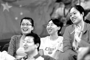 葉莉和前隊友苗立杰坐在一起,戴著眼鏡的葉莉一直在默默為姚明加油。不過當中國男籃最終大比分輸?shù)舯荣惡螅~莉的神色也有些黯然……