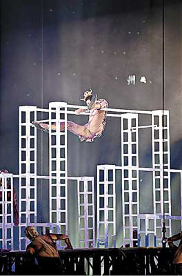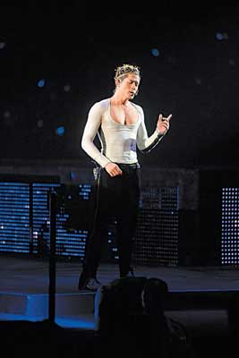 中新網(wǎng)9月1日電 郭富城前晚于澳門舉行首站的世界巡回演唱會,更穿上火紅閃閃“愛的戰(zhàn)衣”新裝載歌載舞。當(dāng)他在架上表演體操環(huán)節(jié)時,因絆腳險墮下臺,幸好自言孔武有力的他,用力支撐身體,繼續(xù)表演。