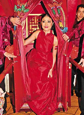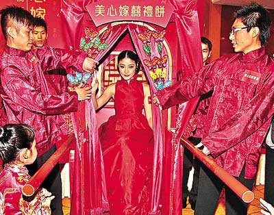 陳慧琳昨以新嫁娘打扮,乘轎進(jìn)場為喜餅廠商宣傳。