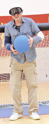 劉德華戴上不透視的眼鏡體驗盲人女子門球。圖片均來自香港《明報》。