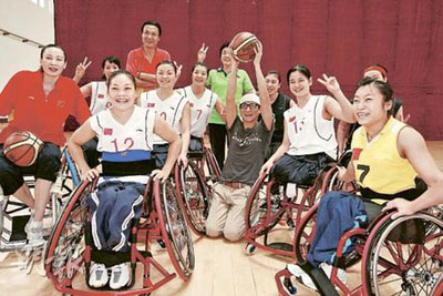 劉德華為輪椅女籃球隊隊員打氣。