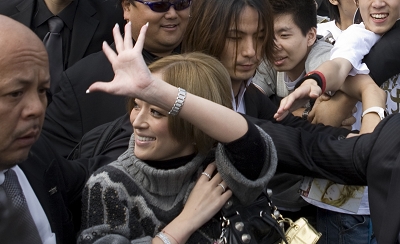 昨日中午11點(diǎn)25分,濱崎步乘坐的JL8877班機(jī)從東京羽田機(jī)場(chǎng)飛抵上海虹橋機(jī)場(chǎng),當(dāng)聽到機(jī)場(chǎng)廣播該航班抵達(dá)消息時(shí),歌迷們一下子瘋狂起來,大聲喊著“AYU!AYU!(濱崎步的名字)”。約11點(diǎn)38分,身材嬌小的濱崎步在20余名黑衣貼身保鏢以及數(shù)名工作人員的簇?fù)硐卢F(xiàn)身,整個(gè)候機(jī)大廳立即陷入瘋狂,歌迷們一邊哭喊著濱崎步的名字,一邊開始朝濱崎步瘋狂跑去,貼身保鏢張開的雙臂也無法阻擋熱情的歌迷。
