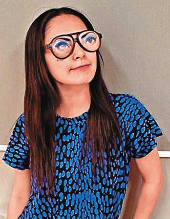 阿嬌戴上趣致眼鏡,叉腰神氣的拍照。
