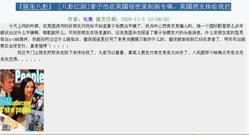 記者近日在國內(nèi)最大的天涯論壇“娛樂八卦”版上看到,有網(wǎng)友貼出“美國雜志報道章子怡要發(fā)片的頭版消息”的帖子,帖子內(nèi)容透露,“章子怡將出首張專輯,還請來了老友公司旗下的5位型男組合A-ONE做伴,曲風(fēng)方面則有麥當(dāng)娜親自制作,據(jù)說現(xiàn)在已經(jīng)在錄音了,明年年出就要在全球發(fā)行。”