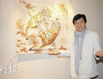 成龍與某品牌合作推出老虎圖案的限量版絲質(zhì)披肩,將會(huì)在香港義賣籌款。(圖片來源:明報(bào))