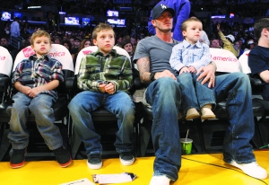前日,貝克漢姆和湯姆·克魯斯(靚湯)兩家人感恩節(jié)后再度帶著他們的全部?jī)号睹。靚湯和小貝顯露出了他們做父親的不同方式。貝克漢姆(上圖)帶兒子去看NBA,抱著2歲的克魯茲,旁邊坐著6歲的羅密歐和9歲的布魯克林。