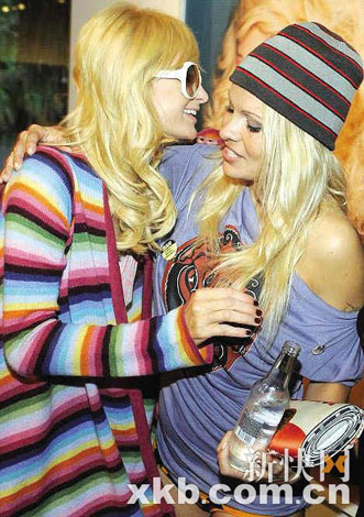 她身穿藍(lán)色T恤,香肩半露,下身僅穿三角褲,站在裸體艷女畫像前大擺pose,席間與“豪門欲女”帕麗斯·希爾頓親密相擁打招呼。