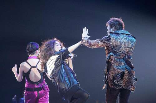 鄭秀文(中)與許志安(右)在臺上擊掌鼓勵(lì)