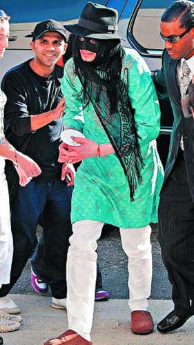 日前,被指患上怪病的邁克爾·杰克遜以極為騎呢與驚嚇的“佐羅”造型外出,不過(guò)邁克爾·杰克遜除了眼罩與帽子外,他的其它裝扮卻跟佐羅相差甚遠(yuǎn)——沒(méi)有戴披風(fēng),還穿著一雙拖鞋。