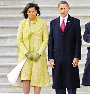新任美國總統(tǒng)奧巴馬的妻子米歇爾在典禮上的穿著,時尚界評價不一,設(shè)計師托雷多說,黃色并非政治場合的傳統(tǒng)顏色,不過它傳達了希望與樂觀的意象。托雷多說,她是用瑞士羊毛蕾斯混法國絲的布料,裁制那套衣服,黃色代表陽光。