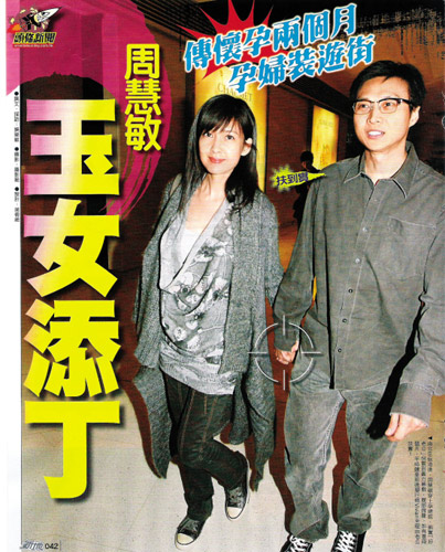 據(jù)昨日出版的某香港周刊爆料,周慧敏近日出席活動(dòng)時(shí)被發(fā)現(xiàn)肚子凸起疑似有喜,而上周該周刊記者又在街上撞見(jiàn)她身穿孕婦裝偕夫出游,似乎新婚不足兩個(gè)月已“好事成雙”。有傳言指,原來(lái)在“倪震濕吻事件”發(fā)生后不久,周慧敏已發(fā)現(xiàn)自己“有喜”,這才是令倪震戲劇性浪子回頭的最大原因。