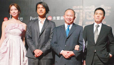 《赤壁》臺(tái)灣首映,林志玲(左起)、金城武、吳宇森和梁朝偉。
