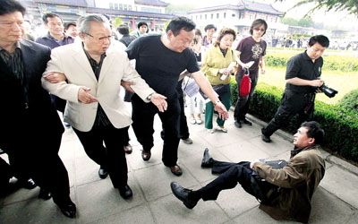 圖為參加儀式的一位相聲愛好者在搶位時正好倒在唐杰忠面前 攝/記者付丁