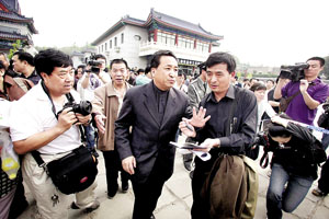 9點(diǎn)10分左右,常寶華、劉惠等人紛紛從側(cè)門(mén)離開(kāi),被群眾和媒體以包夾之勢(shì)分別圍住。