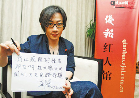 2009年兩大春晚紅人之一——?jiǎng)⒅t,來(lái)到錢(qián)報(bào)紅人館做客了。坐在本報(bào)記者面前的沙發(fā)上,遭遇到“近景魔術(shù)是否將如同選秀一樣走向死亡”這樣并不令人愉快的話(huà)題,劉謙連眉毛也不跳一下,依舊保持著他典型的職業(yè)化的笑容,胸有成竹地拆招:“就算選秀死了,不代表將來(lái)人們就不唱歌了,魔術(shù)同樣是不可缺少的。其實(shí),我根本不擔(dān)心這個(gè)問(wèn)題!