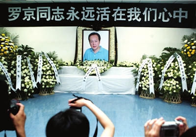 靈堂里擺放著50個花圈。正中間的花圈上寫著:“羅京,我們永遠懷念你”,落款為“愛妻繼紅率子桐敬獻”。