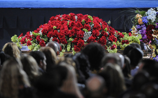 至此,追思會完美落幕,靜躺在舞臺中央的杰克遜靈柩,被鮮花簇?fù)碇,靜靜抬離現(xiàn)場,出現(xiàn)在大幕上的鏡頭是這位天王最后一次的彩排畫面,深色褲子與西服,紅色襯衣,動作嫻熟而精湛,風(fēng)采絲毫不減當(dāng)年,斯人如舊。