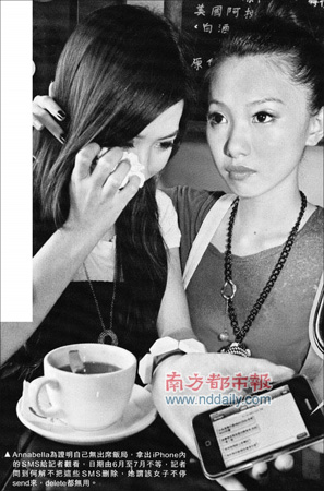 據(jù)香港周刊報(bào)道,有目擊者稱(chēng)見(jiàn)到22歲的口靚模A nnabella(羅靖希)和好姐妹A sa(關(guān)紫藍(lán))進(jìn)入灣仔某酒店,疑似陪客吃飯。當(dāng)港媒向A nnabella求證此事時(shí),她激動(dòng)否認(rèn)傳聞稱(chēng)自己沒(méi)有去過(guò)“不三不四”的飯局。A nnabella表示的確收到過(guò)淫媒的短信,但未答應(yīng)“我們敢發(fā)誓沒(méi)有做過(guò)(飯局陪客),也沒(méi)有給他們電話”,淫媒因此還發(fā)信息罵她:“不要再純情扮潔身自愛(ài)了!”為證明清白,她還公開(kāi)淫媒發(fā)來(lái)的短信,內(nèi)容包括“今晚灣仔道N ight Club有客6000快覆”、“請(qǐng)覆機(jī)去不去,加到一萬(wàn)上房”等等。