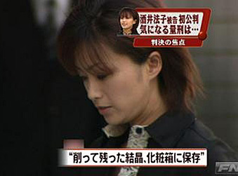 中新網(wǎng)10月26日電 被控違反《興奮劑取締法》持有、使用毒品的日本女星酒井法子(38歲,本名高相法子)首次公審26日在東京地方法院(審判長(zhǎng):村山浩昭)進(jìn)行。酒井在法庭上對(duì)起訴內(nèi)容供認(rèn)不諱。檢方求刑1年零6個(gè)月,判決計(jì)劃將于11月9日下達(dá)。