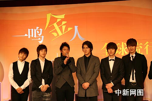 中新網(wǎng)11月16日電 (李季) 16日下午,來自馬來西亞的光良、韓國組合Super Junior—M、港臺藝人張韶涵、蕭亞軒、信和內(nèi)地明星張杰、江映蓉在北京出席“一鳴金人—全球流行音樂金榜新聞發(fā)布會”,眾星紛紛為此活動獻(xiàn)上自己為精心準(zhǔn)備的各種“金色”賀禮。