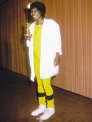 1986年,烏比·戈德堡憑《紫色》獲得最佳女主角獎(jiǎng)。除了演技備受肯定之外,她的這身打扮也絕對讓人眼前一“亮”——一身亮黃色運(yùn)動(dòng)套裝、不合體的白色外套,一雙白色高幫運(yùn)動(dòng)鞋。