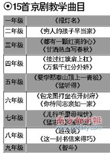 昨日廣東省教育廳體育衛(wèi)生與藝術(shù)教育處副處長(zhǎng)何志強(qiáng)告訴記者,他剛剛看到了教育部的文件。要求是每省選擇一個(gè)重點(diǎn)市開(kāi)展試點(diǎn),每省選20所學(xué)校,分別是10所小學(xué)和10所初中,在音樂(lè)課程中增加京劇曲目教學(xué)。教育部要求從2008年3月到2009年7月在北京、天津、黑龍江、上海、江蘇、浙江、江西、湖北、廣東、甘肅等10省市開(kāi)展試點(diǎn)工作,并在試點(diǎn)的基礎(chǔ)上逐步在全國(guó)推開(kāi)。