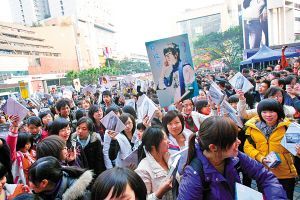 從早上8點(diǎn)開(kāi)始,沙坪壩重慶書(shū)城前就開(kāi)始有郭敬明的粉絲前來(lái)。一位15歲的女孩告訴記者,她是早上9點(diǎn)鐘到的,中途吃飯時(shí)花10塊錢(qián)雇了個(gè)棒棒幫忙排隊(duì),其余時(shí)間都站在這里。女孩的媽媽也陪同前來(lái),但比女兒害羞,不愿意接受采訪,不停地?fù)踝∽约旱哪樧層浾卟灰乃。女兒卻很踴躍:“我們?nèi)叶际切∷牡姆劢z,但我爸爸覺(jué)得男娃兒來(lái)不好,才沒(méi)有來(lái)。”而現(xiàn)場(chǎng)大多數(shù)都是十幾歲的女孩,記者4點(diǎn)半到達(dá)時(shí)已經(jīng)聚集了近千人,把沙坪壩重慶書(shū)城門(mén)口圍得水泄不通。