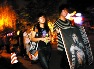 昨晚,歌迷手持邁克爾·杰克遜的照片繞后海行走,悼念這位樂(lè)壇巨星。美國(guó)流行樂(lè)壇巨星邁克爾·杰克遜25日因心臟病發(fā)作在洛杉磯一家醫(yī)院不治身亡,終年50歲。為確認(rèn)杰克遜的死因,洛杉磯驗(yàn)尸官今日將進(jìn)行尸檢。