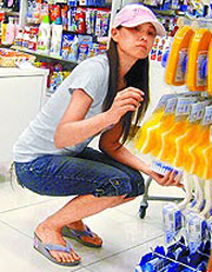 她昨天脂粉未施逛賣場(chǎng),還直接蹲在地上,先買1瓶天然養(yǎng)生醋,又買入浴劑,逛到開架式化妝品,又買了唇蜜及眼影。