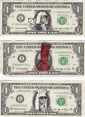 據(jù)悉,此次將喬治·華盛頓的1美元鈔票換成lady gaga肖像的行為,是美國一畫家克里斯·格里森(Chris Gleason)杰作。他將1美元鈔票里,原來喬治·華盛頓的頭像,直接修改成了lady gaga經(jīng)典造型,并分出多個版本。此外,畫家克里斯·格里森還將這12張為一組“偽造”的lady gaga1美元鈔票,放到網(wǎng)上出售,售價為15美元。