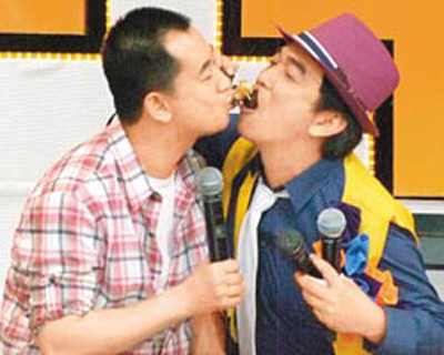 前晚兩人上《我猜我猜我猜猜猜》,介紹臺灣夜市很紅的小吃“海怪級章魚腳”,吳宗憲喂黃海波吃,但怕他咬不斷,主動用嘴巴幫忙咬,差點男男吻。昨晚海清錄中視《新聞6一下》,體驗當主播,大嘆當主播比演戲難太多。