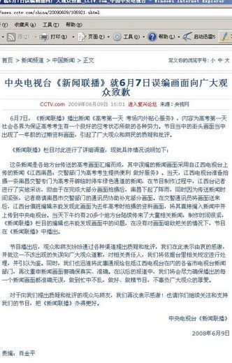 2天后的6月9日,央視在官方網(wǎng)站首頁的顯要位置,發(fā)表“中央電視臺(tái)‘新聞聯(lián)播’就6月7日誤編畫面向廣大觀眾致歉”的消息。