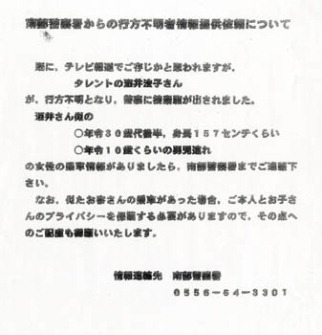 還有消息表明,酒井法子的轎車(chē)至今還停放在自家車(chē)庫(kù)里面。顯然,她是通過(guò)其他交通工具前往山梨的。作者:江楓