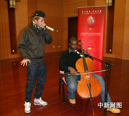 中新網(wǎng)12月10日電 昨日下午,北京電視臺(tái)《環(huán)球春晚》的排練廳迎來了兩位不同國(guó)際的特殊組合,來自美國(guó)的凱文和上海的蟲二,他們用Beat-Box這種特殊的“口技”表演為在場(chǎng)觀眾獻(xiàn)上了一份另類“大餐”。