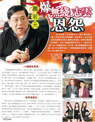 多年來,蕭若元一直不滿無線的壟斷行為。對于陳志云涉貪事件,他有感而發(fā):“我認識他多年,但和他不熟。我很欣賞他的聰明,EQ又高,可惜他聰明有余,智慧不足!标愔驹艵Q高眾人皆知,去年蕭若元召集了20多人在書展上攻擊他,無論別人怎么高喊口號,陳志云仍能鎮(zhèn)定微笑。但蕭若元指出:“陳志云太過濫權(quán)、偏心,作為一個大機構(gòu)的高層,他不應(yīng)該過分高調(diào),也不該和下屬太過親密,那樣會很麻煩。蕭定一就是一個例子,他當年和李彩樺拍拖,就被人指偏心!