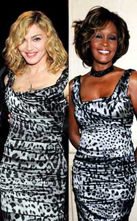 目前正在全球展開巡回演唱會的麥當(dāng)娜,日前穿上一襲Dolce & Gabbana灰色豹紋小洋裝赴宴慶功,竟與惠特妮休斯頓在新專輯發(fā)表會上穿的洋裝是同一款式,兩大老牌歌后選在同日撞衫,相互較勁的意味濃厚。
