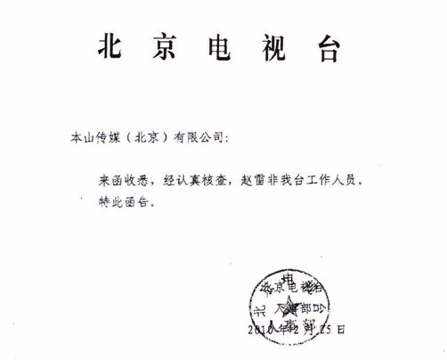 近日,在網(wǎng)上出現(xiàn)了一條消息,作者自稱是北京電視臺導(dǎo)演趙雷。消息稱趙本山在央視春晚演完《捐助》后,因為小沈陽有兩個廣告包袱沒抖出來,在后臺打了小沈陽兩記耳光。對此,本山傳媒鄭重聲明,這條消息純屬捏造。另外,本山傳媒已致函北京電視臺人事部,了解趙雷的身份。北京電視臺人事部回函聲明,趙雷不是北京電視臺工作人員。