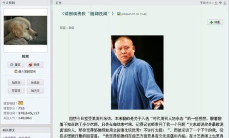 記者根據(jù)網(wǎng)友所曝光的內(nèi)容了解到,此次韓寒發(fā)文的動機(jī)是源于近日的一次采訪,某周刊雜志記者問韓寒“大家都說你是最敢說真話的人,那你覺得郭德綱和周立波誰比較優(yōu)秀?不許打太極!”韓寒當(dāng)時(shí)回答道:“我覺得郭德綱在曲藝方面更具有文化底蘊(yùn)和內(nèi)涵,在才藝表演上也更具文化優(yōu)勢,但是從娛樂人民的實(shí)用角度上看,周立波和郭德綱難分伯仲!倍潞箜n寒擔(dān)心這個(gè)采訪會給記者產(chǎn)生斷章取義的“誤解”,造成“挺郭貶周”的爭議,于是當(dāng)晚趕在這篇采訪見稿前,先發(fā)制人地在自己的博客撰文《請別誤傳我“挺郭貶周”》,詳細(xì)澄清對郭德綱和周立波的個(gè)人見解。