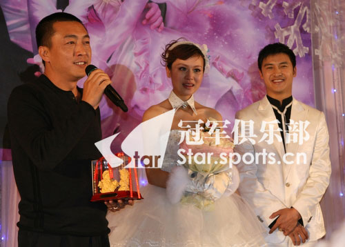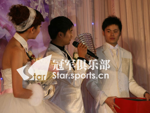 天娛公司董事長王鵬和中乾隆德公司總經(jīng)理、田亮的經(jīng)紀人劉韜分別代表雙方公司為新人贈送了賀禮。王鵬送來了一對小金人,預祝田亮和葉一茜能早日培養(yǎng)出即會唱歌又會跳水的小田亮、小葉一茜。同時劉韜還帶來了李寧公司贈送的古董和王菲、李亞鵬夫婦贈送的水晶杯子和賀卡。(記者 張銳)
