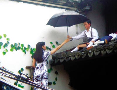 昨日的一場(chǎng)戲,是秦嵐和劇中的兒子吳磊拍對(duì)手戲。由于天氣炎熱,秦嵐說雖有洋傘遮陽,但妝還是化得很快。小演員吳磊當(dāng)天很是不適,拍到最后竟然中暑,又吐又哭,忙壞了劇組的工作人員。按照劇情,秦嵐要從屋頂上往下跳,盡管劇組為她請(qǐng)了替身,但為了追求真實(shí)和進(jìn)度,秦嵐親自上陣,從數(shù)米高的地方往下跳,這場(chǎng)戲總算結(jié)束。