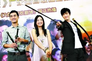 被稱為“偶像版武俠劇“的2008版《射雕英雄傳》(《射雕》)于9日起每晚7時在廣州電視臺綜合頻道播出。昨日,《射雕》的主演胡歌、林依晨、袁弘親蒞廣州,現(xiàn)場大批女粉絲早早就前來支持偶像,并紛紛上臺為3位主演送禮物,結(jié)果胡歌收到的禮物還沒有袁弘多,很多人都認(rèn)為楊康演得非常好。 (記者 陳羽中 實習(xí)生 王高財/文 倪黎祥/圖)