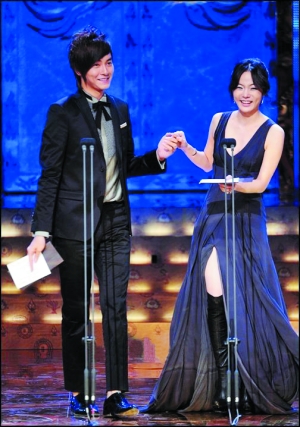 當(dāng)天,獲獎(jiǎng)的韓劇只有獲得“最優(yōu)秀青少年電視劇獎(jiǎng)”的《jungle_fish》與獲得“優(yōu)秀短篇獎(jiǎng)”的《黃金新娘》,雖然有韓星柳真和崔秀鐘擔(dān)任司儀,東方神起任表演嘉賓,還有獲得“最受歡迎男、女演員”的李準(zhǔn)基和南相美出席,但是中國明星的魅力絕對難以抵擋。蔡琳當(dāng)天以低V長裙配高筒靴的造型出現(xiàn),和小綜一起頒發(fā)“最佳男、女演員獎(jiǎng)”,小綜對蔡琳贊不絕口,還頻頻表示自己被電暈了,哄得蔡琳十分開心。而且小綜還不時(shí)用半咸淡韓語和臺下粉絲打招呼,引得粉絲們陣陣歡呼,大喊偶像的名字。